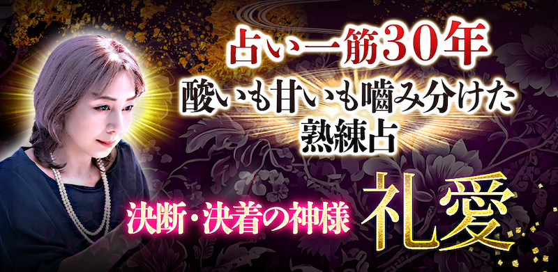 「今が決断の時です。全部私に任せて」この道一筋30年、鑑定人数は延べ5万人の熟練占い師・礼愛が、あなたの人生や恋の岐路に白黒はっきりと答えを出します。どんな迷いも、もう先延ばしにする必要はありません。酸いも甘いも噛み分けた礼愛が、あなたの未来を導きます。